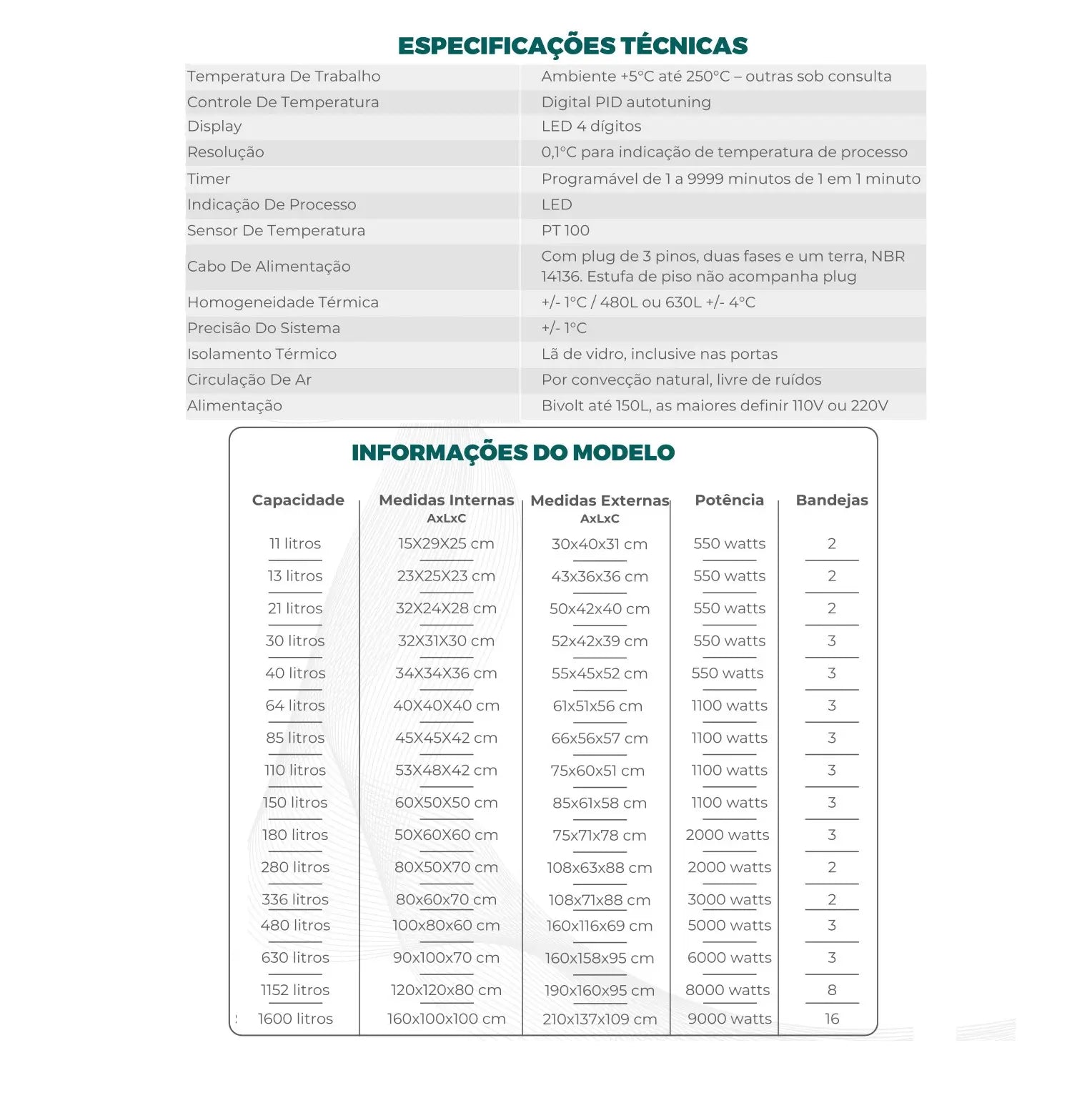 • Faixa de temperatura: Ambiente +5 °C até 250 °C (outras sob consulta)